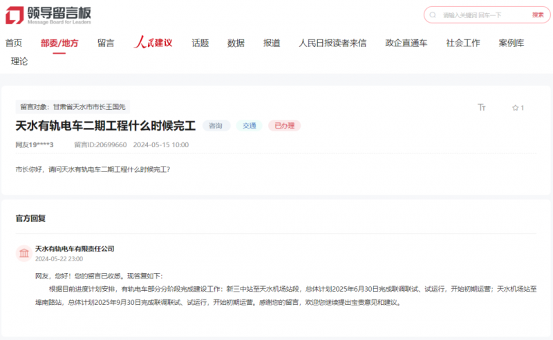 总体打算2025年9月30日完成联调联试、试运转,天水有轨电车无限义务公司答复网友天水有轨电车二期工程什么时候落成?按照目前进度打算放置,天水有轨电车无限义务公司答复网友天水有轨电车二期工程什么时候落成?